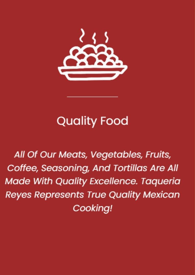We take our food seriously and that is why we clear all prepared vegetables and meats daily. At Taqueria Reyes we believe we there is a taste difference from freshly prepared food and previously refrigerated.
